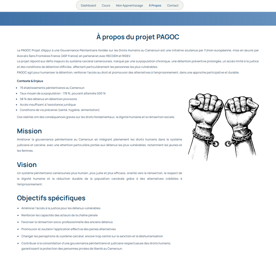 Pourquoi ce projet existe-t-il ? Au Cameroun, de nombreux acteurs de la chaîne pénale manquent de formation adaptée et accessible. PAGOC MOOC a été créé pour répondre à ce besoin en offrant une formation de qualité, gratuite et accessible à tous.